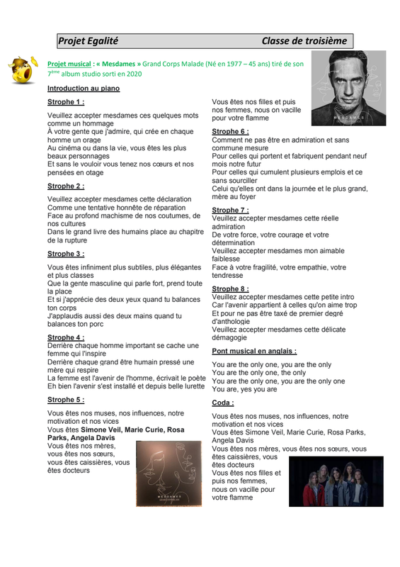 Projet Egalité Chanson "Mesdames" de Grand Corps Malade