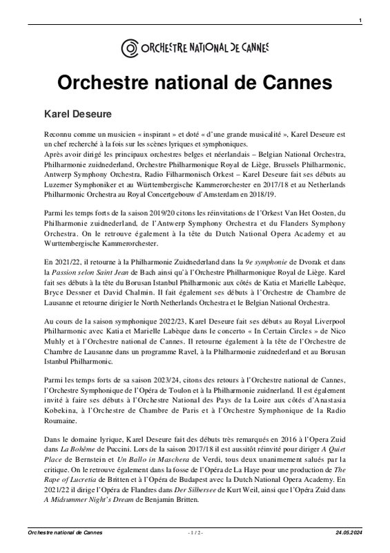 Reconnu comme un musicien « inspirant » et doté « d’une grande musicalité », Karel Deseure est un chef recherché à la fois sur les scènes lyriques et symphoniques. Après avoir dirigé les principaux orchestres belges et néerlandais – Belgian National Orchestra, Philharmonie zuidnederland, Orchestre Philharmonique Royal de Liège, Brussels Philharmonic, Antwerp Symphony Orchestra, Radio